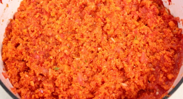 2. Використовуйте м’ясорубку або кухонний комбайн, щоб подрібнити всі інгредієнти до консистенції сальси. Перекладіть отриману суміш у велику каструлю або у важкий казан і варіть на повільному вогні протягом години. Овочі стануть м’якими, і напівфабрикат стане більш рідким.