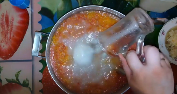 4. Поки ласощі готується, ми не будемо втрачати час і простерилизуем скляну тару та кришки. За 5 хвилин до відключення полум’я вливаємо оцет і масло, додаємо пропущені через часникодавку зубчики часнику.