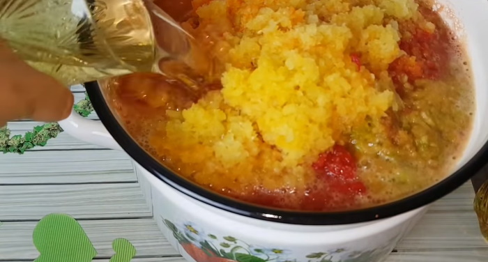 2. Заготівлю перекладаємо у велику ємність, вливаємо олію, розмішуємо і ставимо на варильну поверхню. Після того, як суміш почне кипіти, зменшуємо полум’я і тушкуємо з періодичним перемішуванням 50 хвилин.