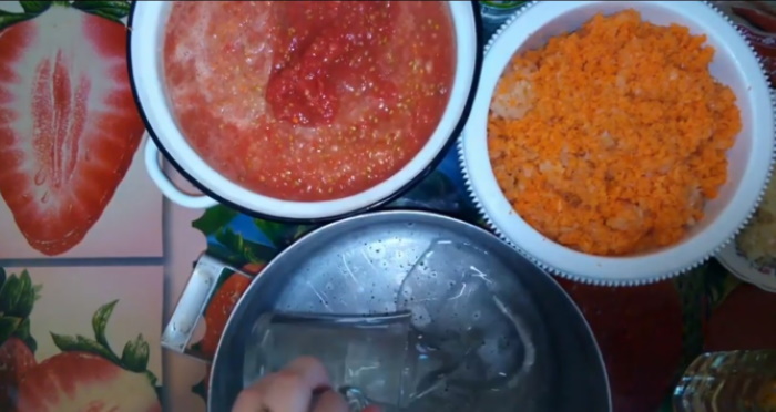 2. Перекручуємо На м’ясорубці в одну чашу моркву з цибулею, у другу – томати і яблука, в третю – часник. У каструлю з товстим дном наливаємо масло, на якому обсмажуємо до розм’якшення суміш цибулі і моркви.