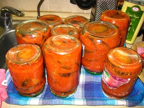 Накрийте теплим пледом, перевертати заготовку не обов'язково. Залиште для поступового охолодження до наступного дня. Потім віднесіть на постійне місце зберігання в прохолодне приміщення. Хоча, з досвіду знаю, що консервація відмінно зберігається в квартирі і не вибухає.
