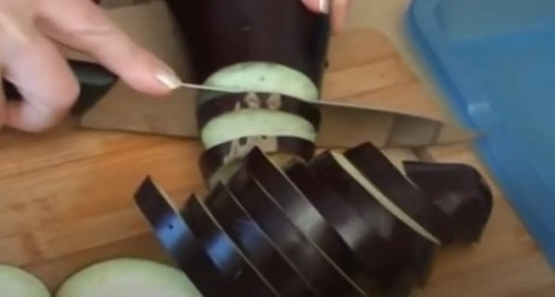 - Настругати синенькі кружальцями завтовшки не більше сантиметра. Посоліть нарізку, залиште на півгодини до виділення соку. Після злийте його, баклажани промийте.