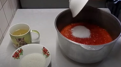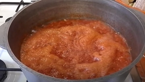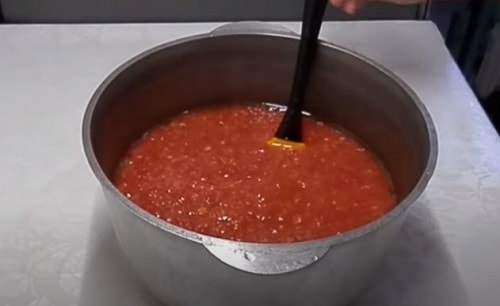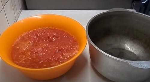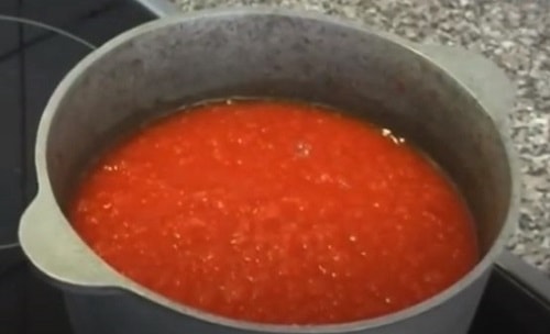 - Помідори обшпарте, опустіть в холодну воду, зніміть шкірку. Пробийте блендером в кашку. Перелийте в каструлю, додайте томатну пасту, рослинне масло, цукор, сіль.