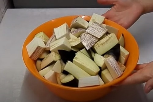 - Покришите синенькі середнім кубиком, посоліть, потримайте півгодини. Потім промийте.