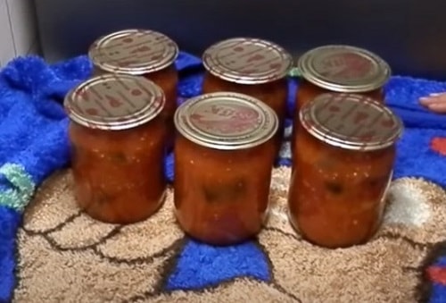 - Розподіліть салат по скляній тарі, закрутіть. Накрийте, щоб заготовка остигала повільно. Потім сховайте в підвал.