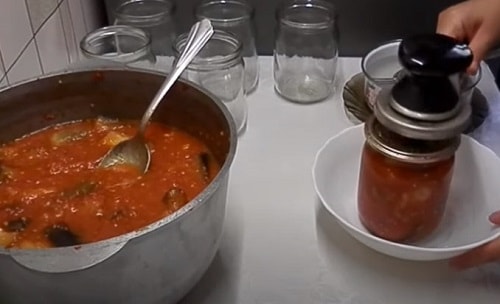 Сбавьте потужність, тихо млоїте вміст протягом 30 хвилин. Швидко наповніть гарячим салатом стерилізовані банки.