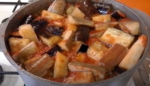 - Коли томатна заправка закипить, відправте в каструлю обсмажені овочі, включаючи синенькі. Гасіть на тихому вогні приблизно 20 хвилин.