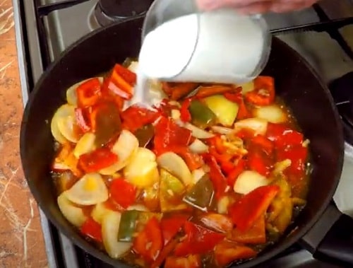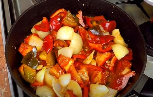 Надішліть на сковорідку болгарський перець, цибуля, насипте цукор. Знову добре перемішайте.