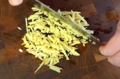 Очистіть імбирний корінь, наріжте спочатку кільцями, потім настругати дуже тонкою соломкою і дрібно порубати ножем.