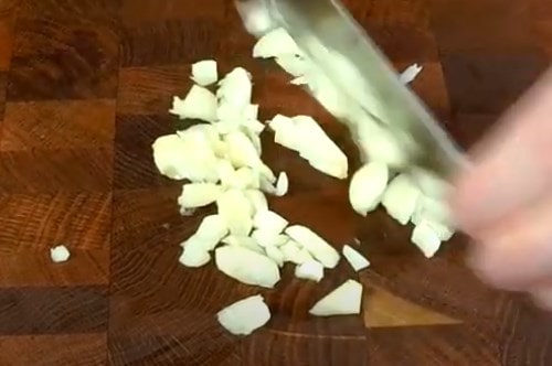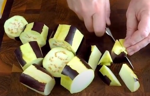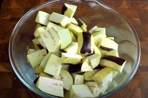 - Наріжте синенькі невеликими кубиками. Подрібніть кубиками цибулю, порубати часточки часнику.