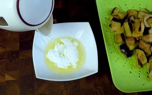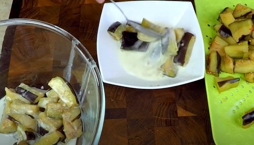 Невеликими партіями занурюйте брусочки синенькі в крохмальний кляр. Трохи потримайте, і перекладіть в іншу миску.