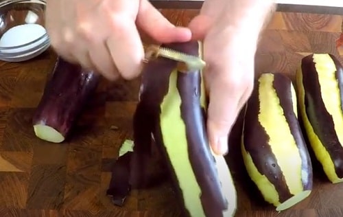 Почистіть баклажани зеброю, шарами, залишаючи стрічки шкірки, як на фото.