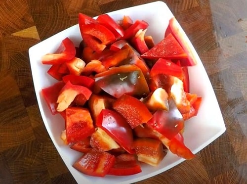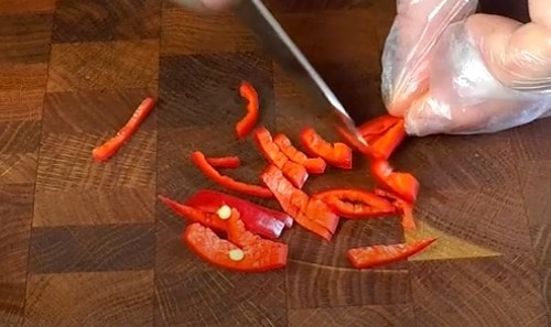 Виріжте з солодких перців насіннєву частина. М'якоть наріжте шматочками довільної форми.