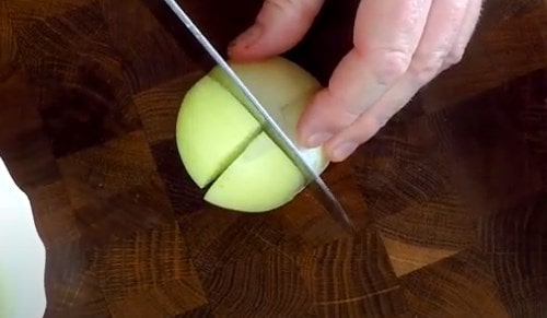 Цибулину поділіть на половинки, потім кожну розріжте на 4 частини. Разом повинно вийти 8 частин.