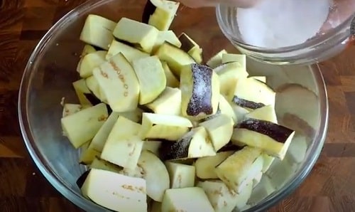 Складіть в миску, пересипте сіллю, щоб овочі виділили якомога більше соку. Завдяки цьому вони зморщаться і вберуть при смаженні мало масла. Заодно піде гіркоту, якщо в вашому сорті синенькі вона присутня.