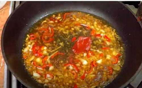 Приготуйте кисло-солодкий соус. Розігрійте сковороду, хлюпніть крапельку масла (можна використовувати жир, що залишився після обсмажування синенькі). Викладіть часникову крихту, перчик чилі, імбир. Обсмажуйте, постійно помішуючи, поки не з'явиться аромат.