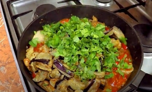 Порубати кинзу. Надішліть на сковороду. Посипте блюдо кунжутом, тушкуйте ще пару хвилин і вимкніть конфорку. І насолоджуйтеся приголомшливими баклажанами в китайському соусі.