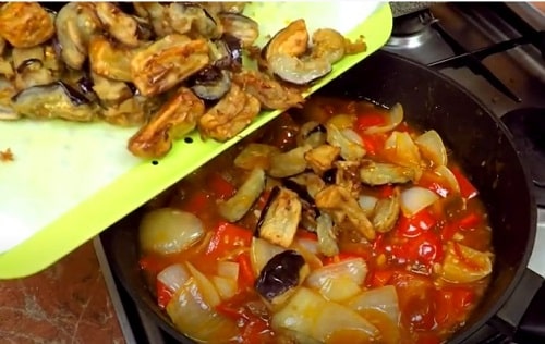 - Додайте синенькі, продовжуйте смажити ще п'ять хвилин.