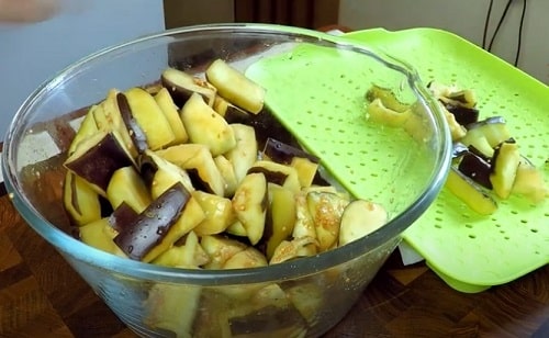 Прямо руками, дуже старанно відіжміть баклажани, перекладіть в іншу посудину.
