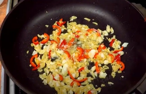 - Розігрійте на сковороді олію, викладіть нарізку часнику і цибулі. Обсмажуйте приблизно 5 хвилин.
