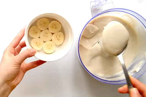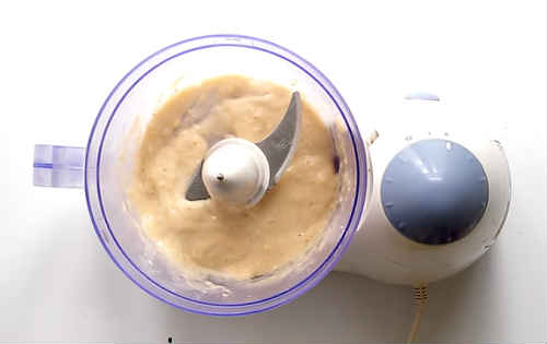 Один банан розламайте на шматочки, подрібніть блендером в кашку.