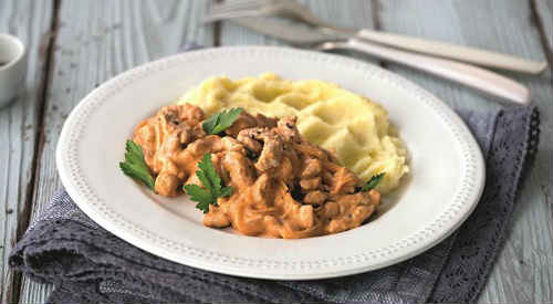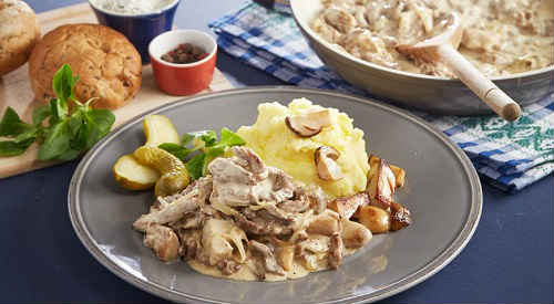 Бефстроганов з свинини з підливкою з вершками