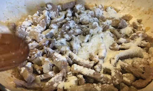 - Підсипте борошно, перемішайте, додайте на сковороду грудинку.