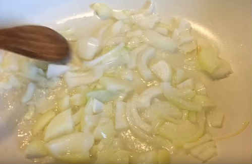 - На сковорідку з прогрітим маслом викладіть спочатку цибульні півкільця, пасеруйте до легкої прозорості.