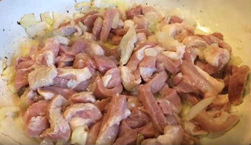 Коли цибуля почне золотитися, викладіть до нього нарізку свинини. Перемішайте, відразу підсолити, посипте перцем. Обсмажуйте м’ясо хвилин 5-10, не більше. Потужність вогню відрегулюйте до середнього.