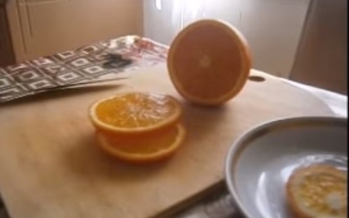 - Помийте цитрусові плоди, залийте на пару хвилин окропом. Потім наріжте товстими кружечками. Розкладіть в кожну банку по 2 кругляшка лимона і апельсина.