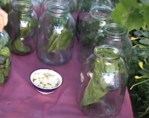 - Щільно набийте скляну тару овочами, перемежовуючи порізаним часником.