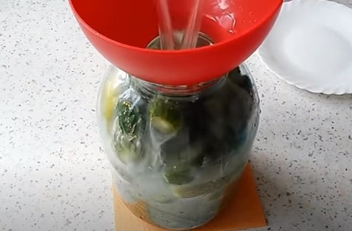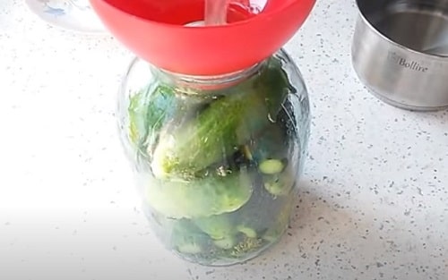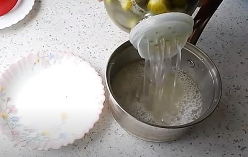- Злийте розсіл в каструлю, закип’ятіть, поверніть назад, в огірки.