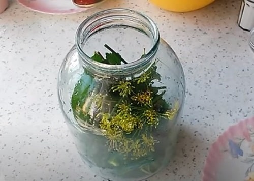 Укладіть на дно банок листя хрону, пару гілочок кропу (один парасольку залиште на верх).