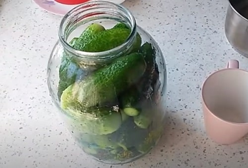 Поки розсіл закипає, огірки промийте під проточною водою, змивання піну. Зверніть увагу, що звільнилося місце і зеленців в тару стало міститися більше. Якщо робите відразу кілька банок, розподіліть так, щоб ємності були заповнені повністю (одна ємність звільниться).