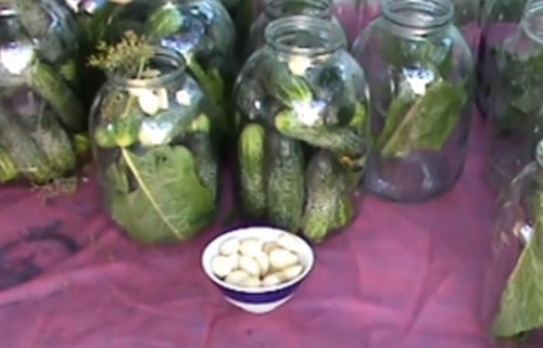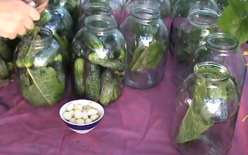 - Набийте балони огірками, перший ряд встановивши вертикально. У порожнечі укладіть різані часточки часнику.