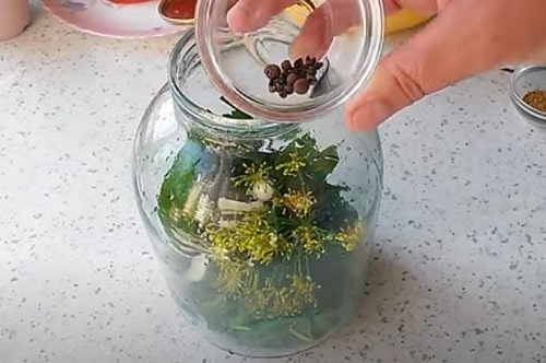 - Закиньте в банки зелень, гілочку кропу залиште для верху.