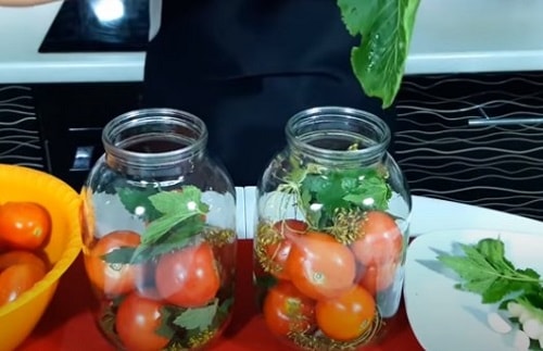 - Покладіть в ємність частина зелені, потім помідори. Перекладайте овочі часником, хроном і перцем, заповнюючи порожні місця. В ході кілька разів струсіть банку, щоб овочі лягли компактніше.