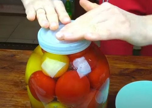 Через заданий час зніміть піну, яка обов'язково з'явиться. Потім закрийте під капронову кришку. Зберігати заготовлені помідори можна тільки в приміщенні з низькою температурою – підвалі, погребі. У квартирі їх тримати не можна