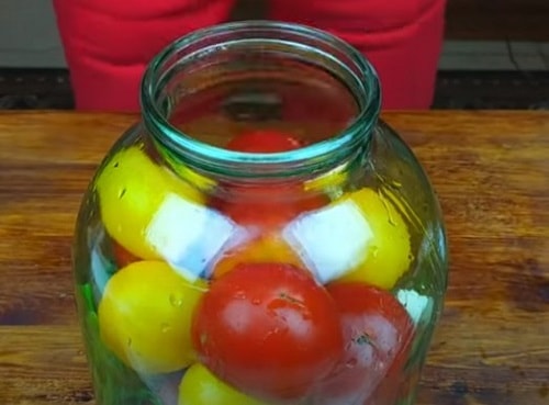 - Зверху покладіть помідори, заповнивши тару до половини.