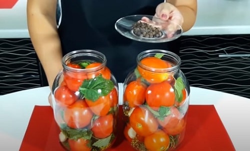 Залишок обсягу заповніть томатами. У проміжки між помідорами кладіть часникові зубчики, розрізані на половинки. У кожну ємність додайте по 6-8 горошин різного перцю.