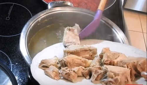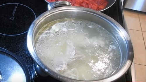 - Приготуйте м’ясний бульйон, затока курку холодною водою і довівши до кипіння. Варіть до готовності м’яса. Після дістаньте, виберіть кісточки, покришіть м’ясо шматочками.
