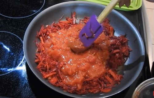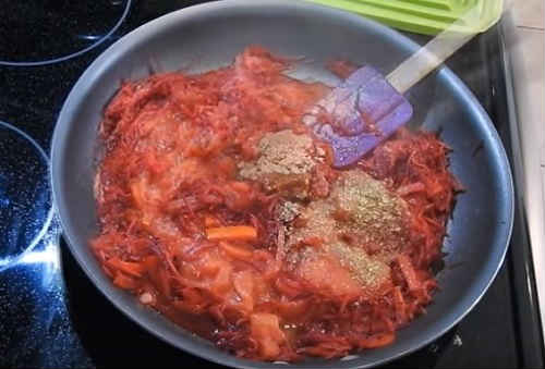 - Розведіть невеликою кількістю бульйону томатну пасту, влийте до овочів. Тушкуйте, поки буряк не стане м’якою.