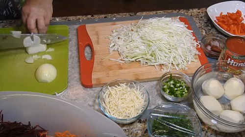 - Наріжте тонкою соломкою буряк, моркву, цибулю, свіжу капусту.