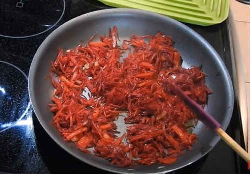 - Одночасно обсмажте на сковорідці цибульну нарізку. Коли цибуля посвітлішає, додайте моркву і буряк. Обсмажуйте 5 хвилин, не перестаючи помішувати вміст.