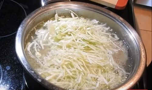 - Додайте капусту, варіть 5 хвилин, слідом відправте картопляну нарізку. Продовжуйте варити до готовності.