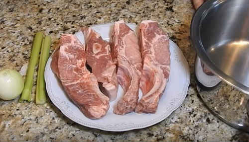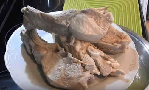 Дістаньте з каструлі сварившееся м’ясо, залиште остигати. Вийміть з бульйону цибулину і черешки селери – вони нам більше не знадобляться. Коли свинина охолоне, розберіть його на шматочки, кістки викиньте.
