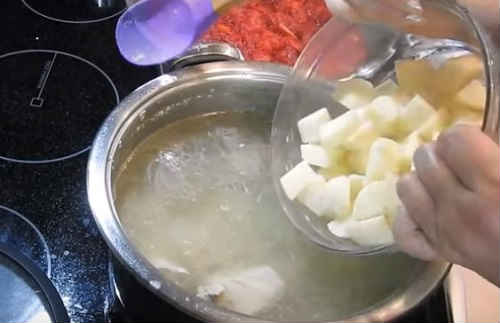Додайте порізаний великими кубиками картоплю, пастернак (якщо його немає, допустимо не додавати).