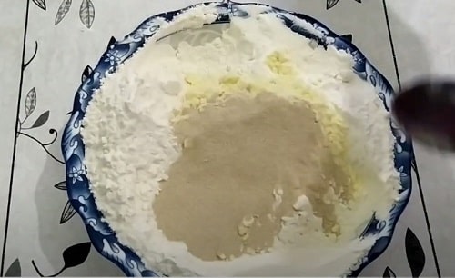 В окремій мисці з'єднайте борошно, сухе молоко, сухі дріжджі. Все добре перемішайте.