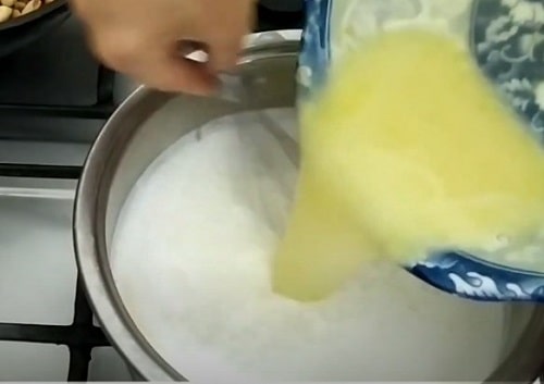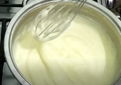 Решту молока закип'ятити. Потім тонким струменем влийте масу, одночасно швидко-швидко розмішуючи вміст каструлі.