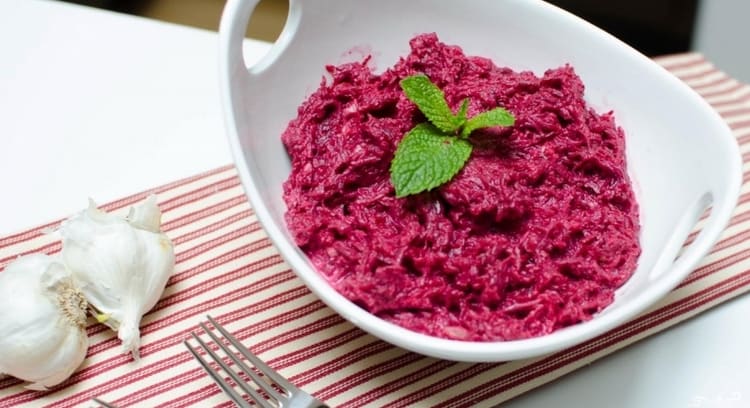 Найчастіше готують варений буряк і потім додають в неї часник і майонез. Порція 100 грам такого блюда буде містити в собі 122 калорії. Не так багато, як здавалося. Особливо буде корисно і смачно, якщо ви самостійно приготуєте майонез – тоді калорійність буде ще менше. Норма споживання цієї страви в день складає приблизно 150-200 грам, та й більше вам не буде потрібно.